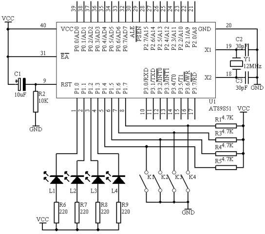 如图4.3.1所示,AT89S51单片机的P1.0-P1.3接四个发光二极管L1-L4,P1.4-P1.7接了四个开关K1-K4,编程将开关的状态反映到发光二极管上。(开关闭合,对应的灯亮,开关断开,对应的灯灭)。