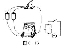 (1)将电压表的正接线柱通过开关与干电池的正极相连,负接线柱与干电池的负极相连,合上开关,这时电压表的示数表示干电池的电压(图6-11)