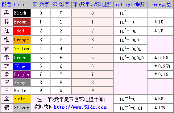 为什么电阻用色环表示阻值?黑、棕、红、绿分别代表的阻值的数字是几?