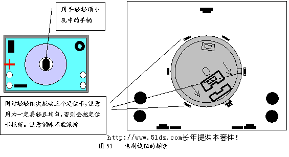 将档位开关旋钮轻轻取下,用手轻轻顶小孔中的手柄(见图53),同时反面用手依次轻轻扳动三个定位卡,注意用力一定要轻且均匀,否则会把定位卡扳断。小心钢珠不能滚掉。